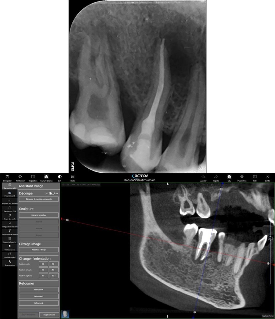 Periapical radiography (phosphorus number 2 plaque and X-MIND® Unity; Acteon) and cone-beam computed tomography (X-MIND® 3D; Acteon) (80 × 80, 150 Micron) were performed and showed periapical lesions on teeth 14, 15, 16, 24, 25, 26, 35, 36, and 46, as well as advanced endo-perio lesions on teeth 26 and 16. orthopantomogram (X-MIND® 3D; Acteon) and bitewings (phosphorus number 2 plaque and X-MIND® Unity; Acteon) also showed wide pulp chambers and roots canals. Figure 1, Figure 2