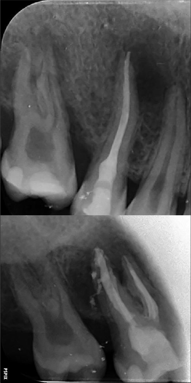 3. Endodontic root canal treatment and retreatment were performed on teeth 14, 15, 16, 25, 26, 35, 36, and 46 using a K manual file 10/30/40/50/60/70 (Dentsply-Maillefer). Hyflex Edm (Coltene) 25/06 was used for the preparation of the canals, which were irrigated with 3% sodium hypochlorite and 17% ethylenediaminetetraacetic acid. Gutta-percha were calibrated to the diameter of the root apex constriction and obturation was conducted using Endosequence Bc Sealer (Brasseler) 15.