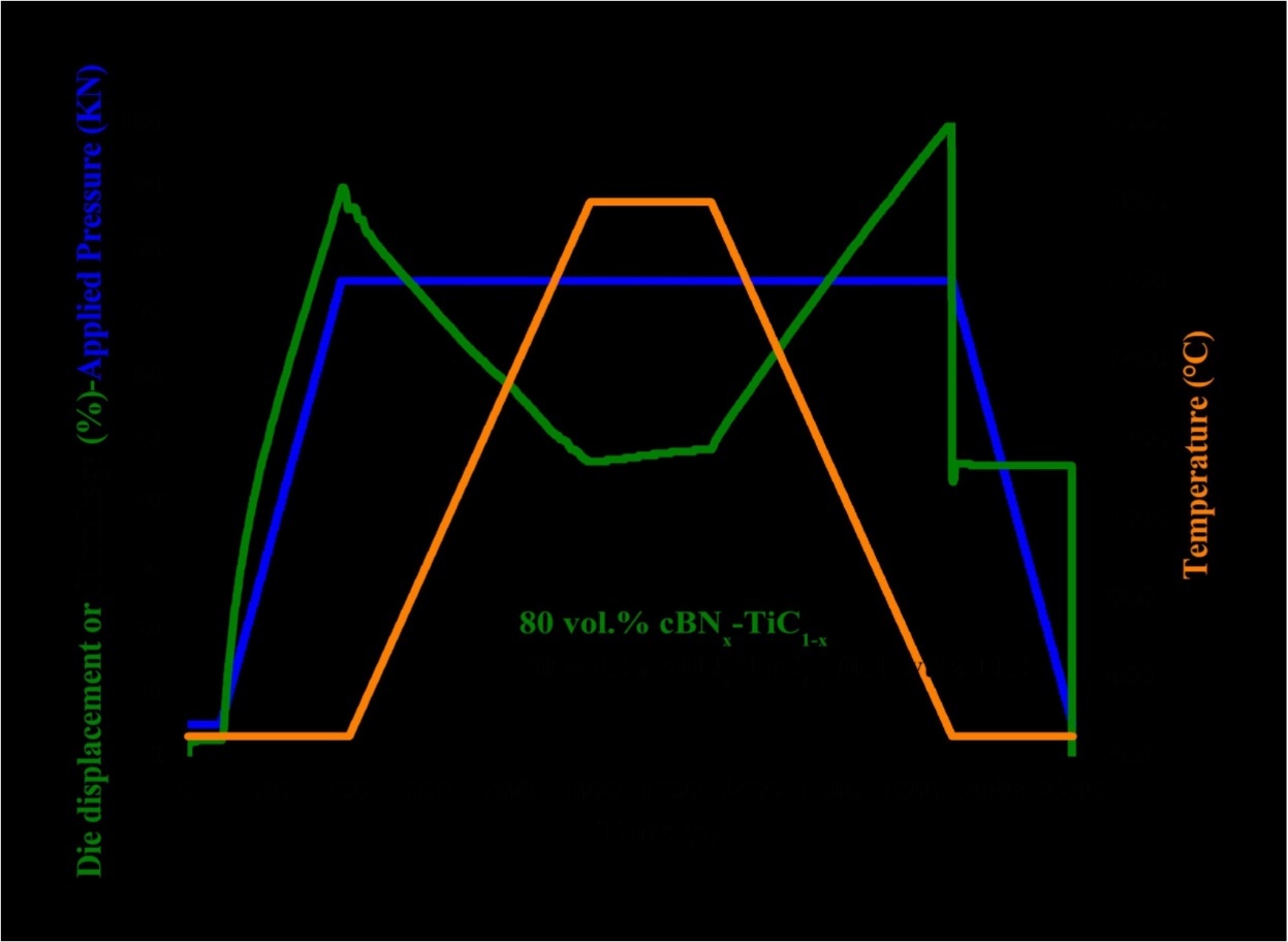(Figure 3) shows the variation of die displacement or shrinkage, temperature and applied pressure in dependence on the heating time during the FASPS sintering. We can conclude that addition of the NC in the nanocomposite ceramics matrix tools improved the sintering behavior of the cBN x-TiC1-x (x=0.8) ceramics matrix nanocomposites (CMNCs) tools.