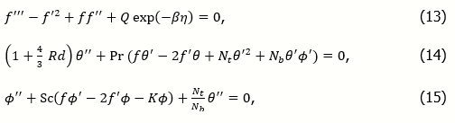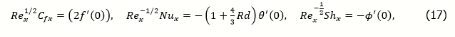 where 𝜸 = (Co𝜸C) / (To𝜸T) is the ratio of thermal to solutal surface tension s.t. R=((C0-C∞)γC)/((T0-T∞)γT) and Ma|L,T=(L𝝙T𝜸T|C)/ να , Ma|L,C=(L𝝙CγC|T)/να are thermal and solutal Marangoni numbers resulting 𝜸=Ma\L,T / Ma\L,C is the Marangoni ratio. (Q=L4πj0 M0/8ν2xρ) is the modified Hartman number, (Pr = ν/α) is the Prandtl number, (Nb=(ρc)p DB C0 x2/ (ρc)f L2 a) is the Brownian motion factor, Sc=ν/D is the Schmidt number,(Nt= (ρc)p DT x2) / (ρc)f L2 a ) is Thermophoretic factor, (Rd= 4Σ* T∞3/ kk*), is radiation parameter and, (β=πL/a) is dimensionless parameter. Skin friction coefficient, local Nusselt and Sherwood numbers are defined by,