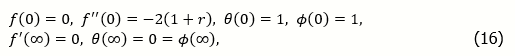 The auxiliary parameters used for the flow profiles in series solutions in HAM are typically considered for controlling the convergence. These parameters significantly moderate the convergence rates thus are vital in achieving the convergence of final solutions. Convergence interval of f, θ and ϕ are sketched in Figure 2. One can see that the intervals of convergence for the aforementioned three profiles are (-0.40, 0.05), (-0.45, 0.05) and (-0.45, 0.05), respectively. The solutions show convergence after19th iteration for velocity profile and 26th iteration for temperature and concentration profiles, respectively.