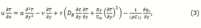 Here u, v represent the velocity components in x, y directions, respectively. μ is symbol of dynamic viscosity, v is the kinematic viscosity, ρf represents the density of fluid, K is used for chemical reaction, σ the surface tension, T0 and C0 are temperature and concentration on the surface, α is representing thermal diffusivity of the fluid, k is symbol of thermal conductivity of fluid. 𝜏 is used for ratio between heat capacity of the fluid, k is symbol of thermal conductivity of fluid. 𝜏 is used for ratio between heat capacity of the nanoparticles (PC)p and heat capacity of base fluid, (PC)f , DB is Brownian diffusion, DT is Thermophoresis, and qr is the typical radiative heat flux that can be written through Rosseland's approximation as follows: