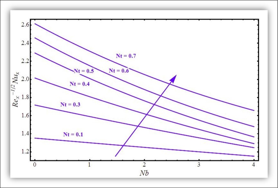 Heat flux enhances with augmented values of Thermophoretic factor (Nt).