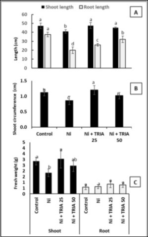 Figure 2. Effect of Nickel (Ni) alone or combined with different concentrations of triacontanol (25 and 50 μM) on A) Shoot and root length, B) Shoot circumference and C) Shoot and root fresh weights, as compared with the control untreated plants. Data are means ± SD (n=4), bars with different letters are significantly different at P ≤ 0.05.