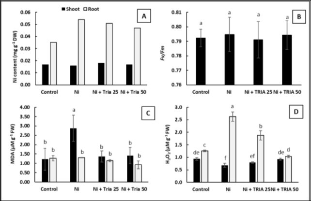 Figure 3. Effect of triacontanol (TRIA) (25 and 50 μM) on A) Nickel (Ni) content B) Quantum efficiency of the photochemical reactions in PSII (Fv/Fm) in leaves, C) lipid peroxidation (MDA) and D) H202 content in shoots and roots of maize plants exposed to Ni stress, as compared with the control untreated plants. Data are means ± SD (n=3), bars with different letters are significantly different at P ≤ 0.05.