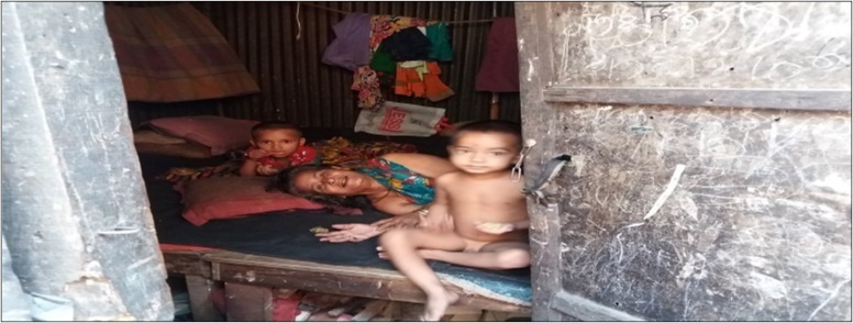 Mrs Ratna Khatun is about 75 years old migrated from Burguna district. She had 4 sons and 2 daughters. Two of her sons washed away by the flooding in 1988. They had to suffer a lot because her poultry, livestock, house everything was washed away. She had a great economy and property loss. Though she got some relief but it was not sufficient for her family. After that she leaved her place permanently with her husband and two of sons and two of her daughters. After coming to Dhaka they stayed to live at Shahjadpur Jilpar slum in a rental house. Her husband had late five years after coming Dhaka. All of her son and daughter already got married and live in other place and never take care of her. Last few years she leaves alone and did not do regularly work as a maid. She is poor, but she is not included in government old age allowances. She suffers from different types of physical problems such as fever, less eye-sight, reduced hearing power and other disease. Every time people threat her to remove house from there. Nibours escaped her. If someone gives her food, only then she eats.