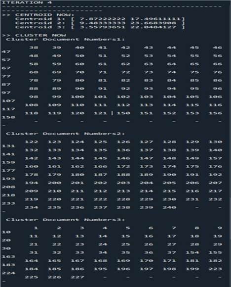 We start by implementing the k-means algorithm based on data distribution models using this algorithm, we want to distribute the data to a precise number of clusters. To achieve this task, we have chosen a dataset (of 240 data). In figure 1 we choose the dataset and the number of cluster k = 3. We get the execution result after four iterations as shown in Figure 2. Figure 3 illustrate the performance measure of K-means while figure 4 shows the distribution of clusters.