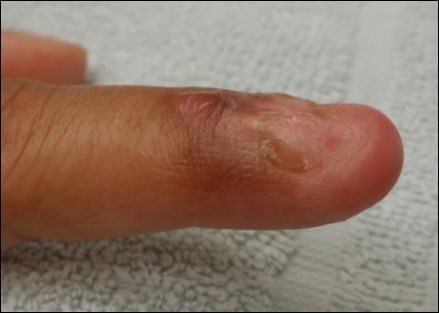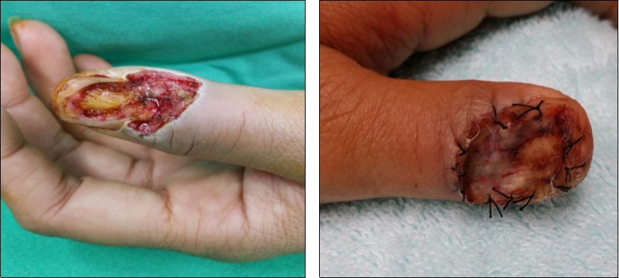 Case no. 2. 48 y/o, female. Laceration wound of right index finger; dorsal oblique soft tissue defect; nail bed defect; over DIPJ with bone and joint exposure. (Figure 5, Figure 6, Figure 7, Figure 8.)