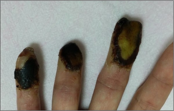 Case 6. 54 y/o male. Chemical burn, full thickness burn wound of right middle finger; tendon exposure. (Figure 19, Figure 20, Figure 21).