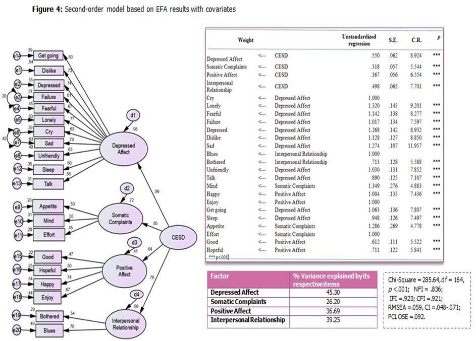 To cross-check whether or not the 4-factor structure as proposed by Radloff holds true, we constructed a visual diagram of the CES-D based on Radloff’s recommendation and ran an analysis. Results in Figure 5 revealed that 2 of the average explained variances were <50%, while the other two were >50%. Model fit indices indicate somewhat model fit (Figure 5). However, multicollinearity exists between 2 pairs of factors with a Person’s correlation of >.9043: Depressed Affect and Somatic Complaints; and Somatic Complaints and Interpersonal Relationships. The high correlation values indicate that these 3 factors measure relatively the same concept and should be restructured. Therefore, it is evident that the 4-factor CES-D model based on Radloff’s recommendation does not fit our data well.56