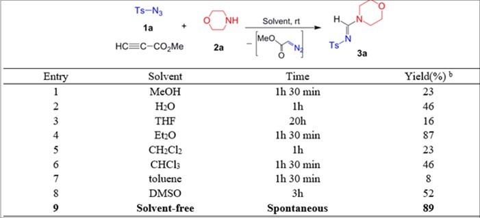 Table 1. Optimization of the reaction conditions for the three-component reactions of tosylazide1a, methyl propiolate and morpholine2a.
