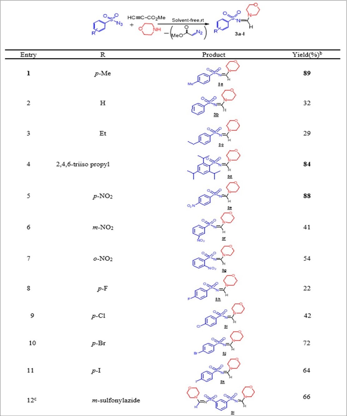Arenesulfonylazides were successfully employed as efficient reacting partners in three-component coupling with methyl propiolate and morpholine to afford the corresponding sulfonyl amidines (3a-l) which were produced with yields varying from 22 to 89%, spontaneously. The reactions proceeded very efficiently, and led to the formation of the corresponding sulfonyl amidines 3a, 3d and 3e in good yields (Table 2, entries 1, 4 and 5) as 89, 84 and 88%, respectively. However, a drastic decrease in yield (32 and 29%) was observed with the benzene sulfonyl azide and the para-ethylbenzenesulfonylazide (Table 2, entries 2 and 3). On the other hand, the electron with-drawing para-nitro was found to be more reactive than the ortho-nitro and the meta-nitrobenzenesulfonylazides (Table 2, entries 5-7) with 88, 41 and 54%, respectively. The reaction was also compatible with the presence of the halogen groups. Thus, the bromo and iodo groups led to the desired products 3j, and 3k with better yields compared to the fluoro and chloro groups which led to the compounds 3h and 3i (Table 2, entries 8-11) with 72 , 64, 22 and 42%, respectively. It is noted that the disulfonylamidine3l was obtained with a yield of 66% (Table 2, entry 12).