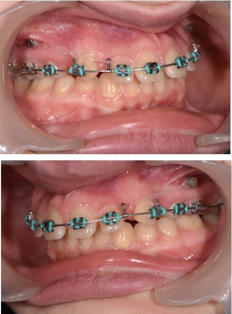 Figure 5.Retraction of the upper incisors with elastics chains placed from crimpable hooks to orthodontic implants.