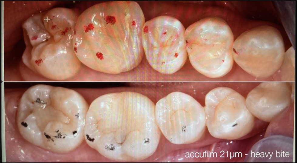 All materials and systems differ as do the recordings. Bite intensity is difficult to record except with the PMscan which also records infra occlusion 10. The figures suggest that intensity is important in aligning implant restorations and in monitoring bruxism and clenching pathologies 11. Paper and film do not record intensity and their markings are not permanent. Primescan requires a CAD system and does not record intensity or movement. PMscan records intensity and movement. The relation of occlusal contact to touch is unknown. What is evident is that the older systems may not fit present needs. New restorative procedures, techniques and repair systems require monitoring systems that fit the demands of today. Contact, intensity and permanent multidimensional recording systems are essential. The understanding of occlusion remains elusive.
