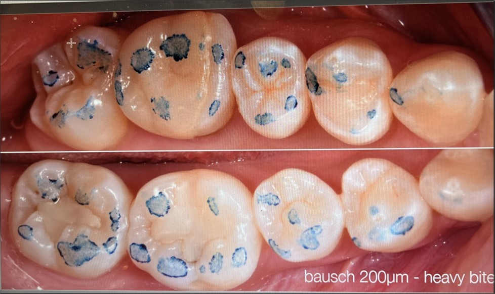 This observational study compares four clinically used methods for recording occlusal contacts. Recordings were made using each of four different methods on the same subject who volunteered participation. All recordings were made in office by one clinician (CS) during the same time period. A clinical subject with few restorations was selected and the subject agreed to the procedure along with the right to publish the results. There are no quantitative measurements. Ankylosis is a factor that was not addressed. The recording indicator systems evaluated were: 1. Accufilm (Parkell, Brentwood NY. USA). 2. Blue paper (Bausch, Nashua NH. USA), 3. Primescan (Densply/Serona, Waltham MA. USA), 4. PMscan (Mco, Boston MA. USA). In all procedures the subject was advised on how to close and the procedure was repeated. The subject made one hard closure into or onto the marking surface and the results were recorded and are displayed in (Figure 1) (Figure 2, Figure 3, Figure 4 )