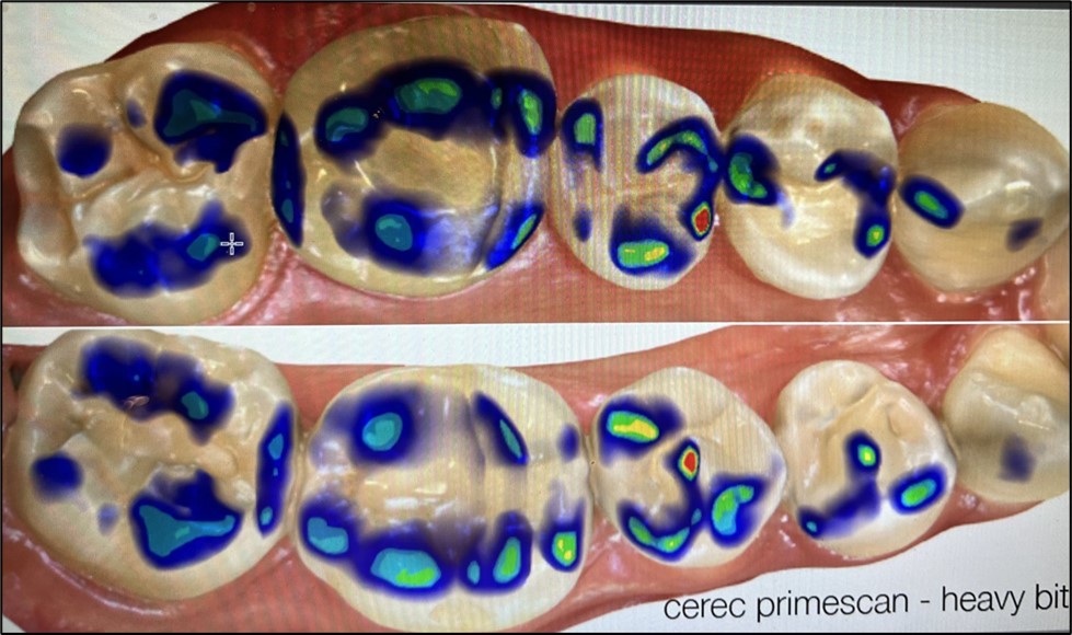 Material 3: Primescan {Figure 3} recorded the occlusion digitally. Bites may vary because they are recorded digitally. Intensity of closure and parametric movements are not recorded.