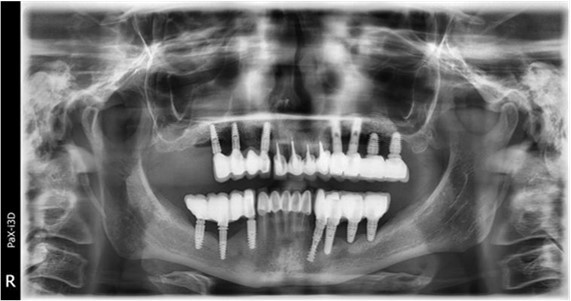 2012: Placement of 15 multiphase dental implants with bone grafting. During the course of treatment, one implant in quadrant 1 (distal) was removed prior to completion of prosthetic rehabilitation (after approximately 6 months).