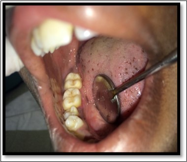 A 13year-old male patient reported to the Department of Pediatric and Preventive Dentistry with a chief complaint of the presence of a ‘lump’ in the lower right back region. The history revealed that the patient had buccal abscess in relation to 85 two months back for three days which reduced on medications. The tooth (85) exfoliated within 1 month and soon after the exfoliation, patient noticed a lump in that region. The lump was painless and increased in size in the last one month. Patient experienced discomfort in speech since the last one week. No abnormality or asymmetry was noted on extra-oral examination. Intraoral clinical examination revealed a painless, fibrous nodular mass with a sessile base in the right lower gingival margin extending from the mesial surface of 44 to distal surface of 45 on the lingual surface, measuring approximately 2 cm in diameter and showing a rough surface and color similar to that of the adjacent mucosa(Figure 1)