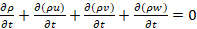 In which, t is the time, ρ is the density, u, v and w are the velocity vector components of u in the x, y and z directions.