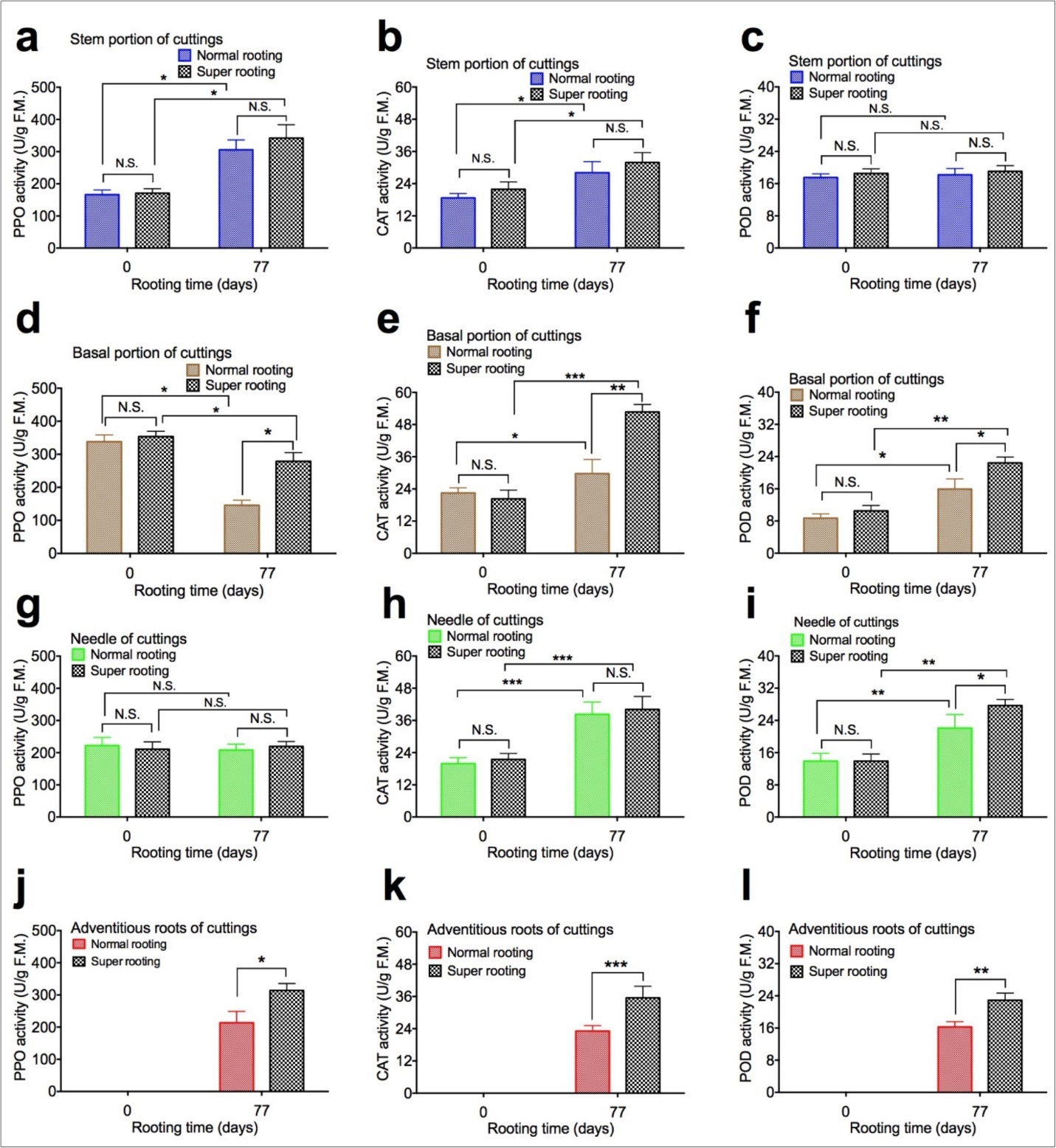 Figure 3.PPO, CAT, and POD activity in shoot cuttings of T. chinensis var. mairei at 0 and 77 days after planting. PPO (Figs. 3a, 3d, 3g, and 3j), CAT (Figs. 3b, 3e, 3h, and 3k), and POD activity (Figs. 3c, 3f, 3i, and 3l) in stem portion, basal portion, needles, and adventitious roots of rooted cuttings of T. chinensis var. mairei at 0 and 77 days after planting. Experiment was repeated five times. The statistically significant difference between groups was determined by one-way ANOVA. Data are presented as means of five independent experiments. Error bars represent standard error. The asterisk indicates significant differences compared to the rooted cuttings with low rate of root formation, as assessed by a t-test. *P<0.05, **P<0.01, ***P<0.001, significant relative to Phase I. N.S., no statistics significance. Vertical bars indicate standard error.