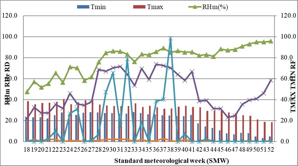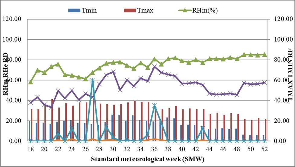 The meteorological data of 2021 was recorded from Agrometeorology observatory of PAU Regional Research Station, Abohar is presented graphically in Figure 1. The maximum weekly mean temperature ranged between 22.3°C to 41.4°C and mean minimum temperature ranged between 5.7°C to 26.0°C. The weekly mean maximum and minimum temperatures of 41.4°C and 5.7°C were recorded during standard meteorological week of 21st and 52nd respectively. The mean maximum relative humidity was 85.3% during 52nd standard meteorological week. The area had received the total rainfall of 169.8 mm during the entire crop season and there were 13 rainy days during crop season.