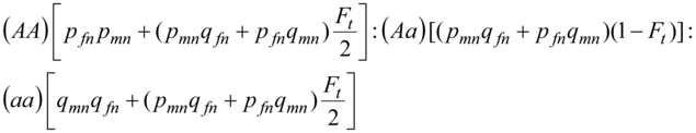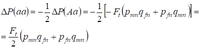 Let's find first the total probability of a heterozygote Aa occurrence, i.e. P(Aa) at the opportunity of the random consanguineous mating. This probability follows from the following logic of mating: the origin of alleles is non-consanguineous (the probability of this hypothesis is P(H1) = 1 - Ft ) also arises heterozygote Aа (conditional probability of this event is P(Aa/H1) = pmnqfn + pfnqmn, see the formula (7)) or origin of alleles is consanguineous (the probability of this hypothesis is P(H2) = Ft) and arises heterozygote Aа (conditional probability of this event is equal to zero P(Aa/H2) = 0 ). Last statement is defined by that at consanguineous origin similar alleles in homologous Х-chromosomes cannot the heterozygoteАа arise consisting different alleles.