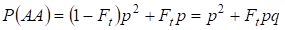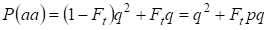 This formula follows from the following logic of mating: the origin of identical alleles in homologous autosomes is non-consanguineous (the probability of this hypothesis is P(H1) = 1– Ft )also arises homozygoteаа (conditional probability of this event is P(aa/H1) = q2) or origin of identical alleles is consanguineous (the probability of this hypothesis is P(H2) = Ft ) and arises homozygoteаа (conditional probability of this event is P(aa/H2) = q). The probability q of the homozygote aa occurrence in the latter case is determined by that if allele a is in one autosome then at consanguineous origin of homozygote same allele necessarily should be and in the homologous autosome.