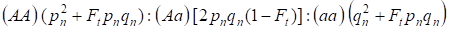 Thus, according to (3) and (4) total frequency of homozygotes (dominant and recessive) in inbred family tree increases on 2Ftpq. Hence, frequency of heterozygotes decreases for the same size and to become equal 2pq - 2pqFt = 2pq(1-Ft) since the sum of the all zygote frequencies is equal 1.