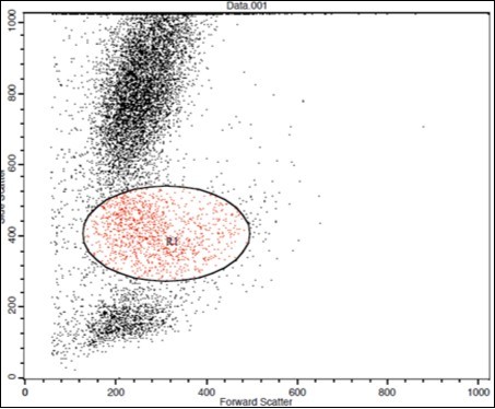 The steps involved in the cytoplasmic staining of phycoerythrin PE labeled monoclonal antibodies (MoAb) for detection of both TIE2 and Moab were performed in a biotechnology company (Becton Dickinson Bioscience in San Jose, California). Peripheral blood mononuclear cells (PBMC) were isolated from whole blood by Ficolldensity centrifugation and were then stained with10 microliters of CD14 fluoroiso-thiocyanate (FITC) and incubated for 15 minutes at room temperature in the dark. This was then followed by incubation, red blood cell (RBC) lysis, washing with phosphate-buffered saline (PBS), and addition of BD Cytofix/Cytoperm solution to fix the cells, and incubation for 10 minutes. After incubation, the cells were washed with PBS, followed by the addition of permeabilizing solution and 10 microliters of TIE2, and incubated for 30 minutes at room temperature. Flow cytometric analysis was done by fluorescence-activated cell sorter (FACS) caliber Flow cytometer (Becton Dickinson Bioscience, San Jose, California). Isotype-matched antibodies were applied with all the samples as controls. Forward and side scatter histograms were used to define the monocytes population 18.