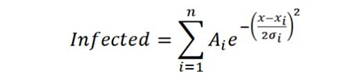 where all the cases (represented as "Infected") are the result of the superposition of n epidemic waves, where each one of them (from i = 1 to n) has its own amplitude (Ai) and extension according to the value of σi, centered at position xi. In this first study, the number of waves (n) was defined manually. Therefore, it only remains to determine the parameters of the model from a least squares adjustment according to the cases registered daily, using a program implemented in Python, whose procedure has been validated in previous publications (see for example 9, 10, 11, 12).