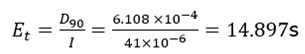 where, D is the exposure dose in J/m2, Et is the exposure time in seconds, and I is the irradiance in W/m2. If the irradiance is related to a dose that refers to 90% disinfection rate of the total population of the microorganism, the exposure dose is defined as D90. This disinfection rate dose can be calculated from the following equation 14: