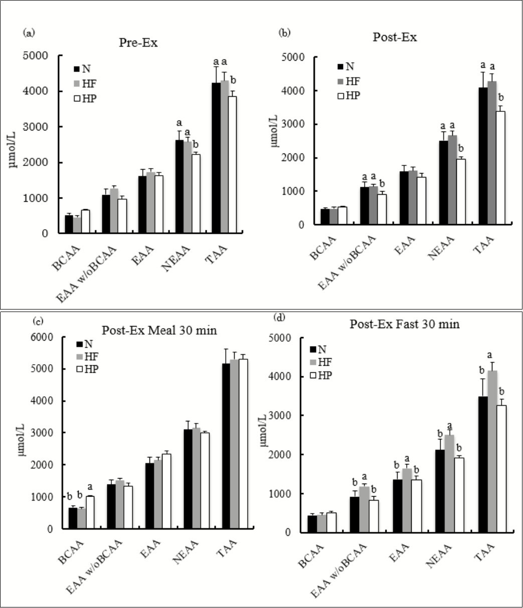 The plasma amino acid concentrations are shown in Figure 2a-d. Pre-Ex, non-essential amino acid (NEAA) and total amino acid (TAA) concentrations were significantly lower in the HP group than in the HF and N groups, while branched-chain amino acid (BCAA), essential amino acid (EAA) and EAA without BCAA (EAA w/o BCAA) concentrations were not significantly different among the groups. Post-Ex, EAA w/o AA, NEAA and TAA concentrations were significantly lower in the HP group than in the N and HF groups, whereas BCAA and EAA concentrations were not significantly different among the groups. At 30 minutes after consuming the respective diets (Post-Ex-Fed), the BCAA and leucine (data not shown) concentrations were significantly higher in the HP group than in the other two groups, while the EAA w/o BCAA, EAA, NEAA and TAA concentrations were not significantly different among the groups. At 30 minutes after exercising while fasting (Post-Ex-Fast), the EAA w/o BCAA, EAA, NEAA, TAA concentrations were significantly higher in the HF group than in the N and HP groups, while the BCAA concentration did not differ significantly among the groups (Figure 2d).