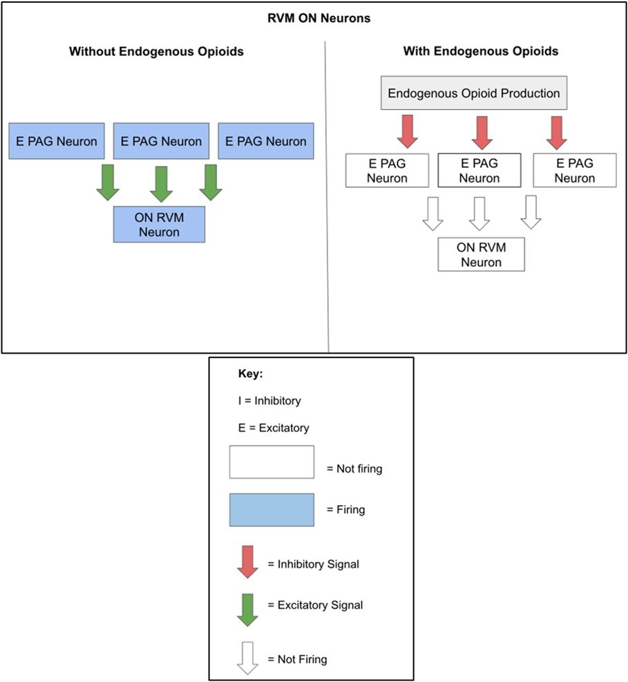 The first circuit involves ON RVM neurons, as the diagram below outlines the circuit’s structure and how endogenous opioids affect it. When an individual is in pain, excitatory PAG neurons are activated and send excitatory signals to the ON RVM neurons, therefore increasing their firing: enhancing pain facilitation. However, when endogenous opioids are produced, they bind to opioid receptors on the excitatory PAG neurons. The activation of opioid receptors has an inhibitory effect, and so when the opioids bind to these neurons, it inhibits the excitatory signals they were initially sent to the excitatory RVM neurons. Due to the lower number of excitatory signals being sent to the ON RVM neurons, there is a decrease in their firing, which produces analgesia. Figure 1. is a diagrammatic representation of this circuit.