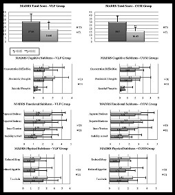 Figure 2 shows the hetero-evaluated MADRS for two groups. The Independent Samples t-Test emphasized a greater change in the COM group than in the VLF group for the Pessimistic Thoughts subitem: at T0 the data showed no significant difference, whereas at T1 a significant difference (p<0.01) between the two groups was observed.