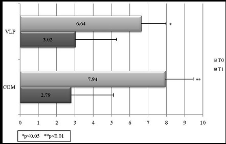 VAS demonstrated a significant difference between assessments in perception of the intensity of pain (Figure 3). These data are confirmed by the Independence Samples t-Test which highlighted a higher significant improvement in the COM group (p<0.01) than in the VLF group (p<0.05).