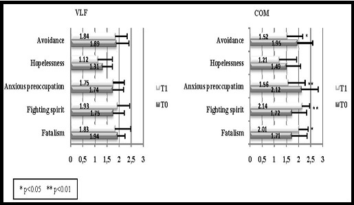 The Mini-MAC showed important changes in switching coping strategies. Between T0 and T1 in the usual care group only a trend of a non-significative reduction was found, while the subjects treated with combined therapy showed significant changes in Fatalism, Fighting Spirit, Anxious Preoccupation and Avoidance (Figure 4). In addition, the Independent Samples t-Test highlighted a significant difference (p<0.05) between groups in improvement on the Avoidance subscale.