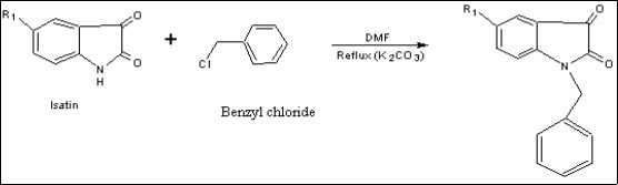 Equimolecular quantity of isatin and benzyl chloride has taken in RBF. To this mixture 20 ml of dimethyl formamide and potassium carbonate has added. After gently shaking the mixture refluxed for 2hrs. The mixture has cooled and pours into the 100 ml of ice cold water. The resultant orange colour precipitate has collected and washed with water. After drying it has recrystallized from ethanol. M.P. is1200C-1300C 1, 2.
