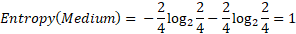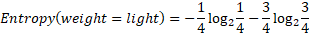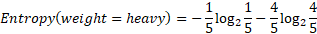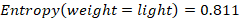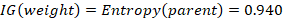 While the entropy for all the values is null, so the information gain of the “weight” attribute is equal to the entropy of the initial dataset: