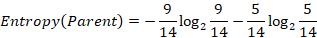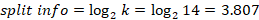 Where c is the total number of splits, and p(vj) is the fraction of the records associated with a split by the total number of all the records. For an example, the weight attribute has fourteen possible values, so the number of splits c in this example is equal to fourteen, and the number of records associated to each possible value is equal to one, each attribute value has the same number of records then: