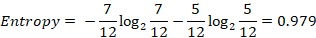 We have four male and three female so the entropy is equal to:
