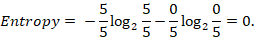 The entropy value indicates that there is no disorder, and that the hole is homogenous. To conclude when a group of objects of different class, or a set of data is heterogonous, the disorder is very high then the entropy value is also high, otherwise when there is homogeneity among a set of data then the entropy value is zero.
