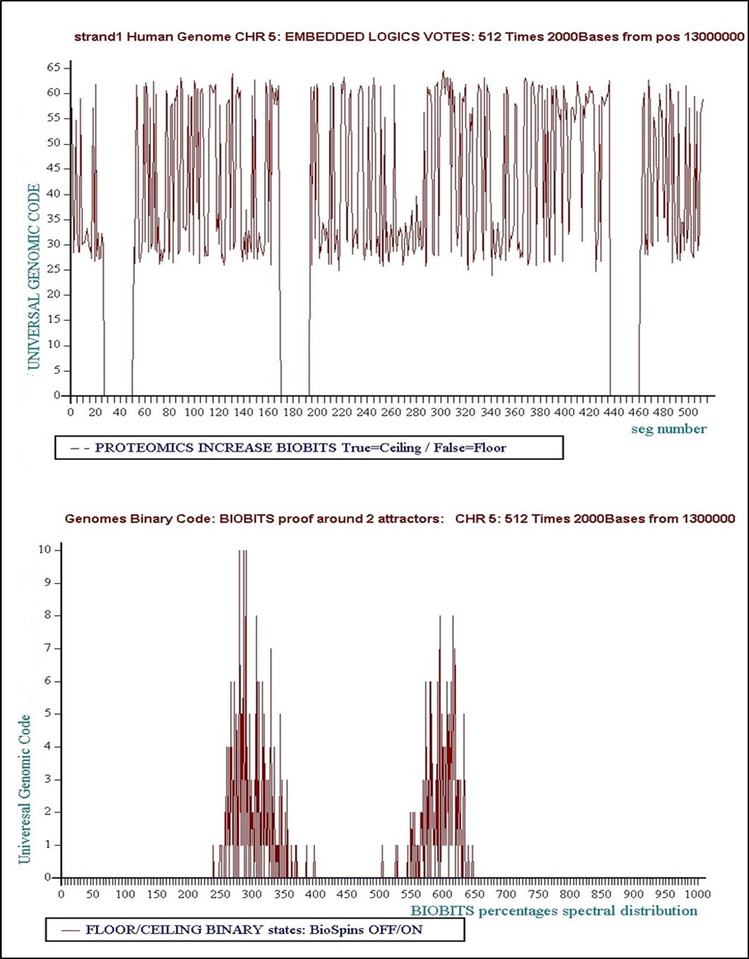 In this paper, the analysis of the genetic information (proteomic image) of the entire human genome highlights a binary modulation (Figure 15 and Figure 16) throughout the genome.This binary modulation is distributed statistically around 2 binary attractors whose ratio is equal to TWO and whose respective values are phi (level "high" = 1) and phi / 2 (level "low" = 0) With phi = 0.618 ... = 1 / Phi the Golden ratio (Phi = 1.618. ..).