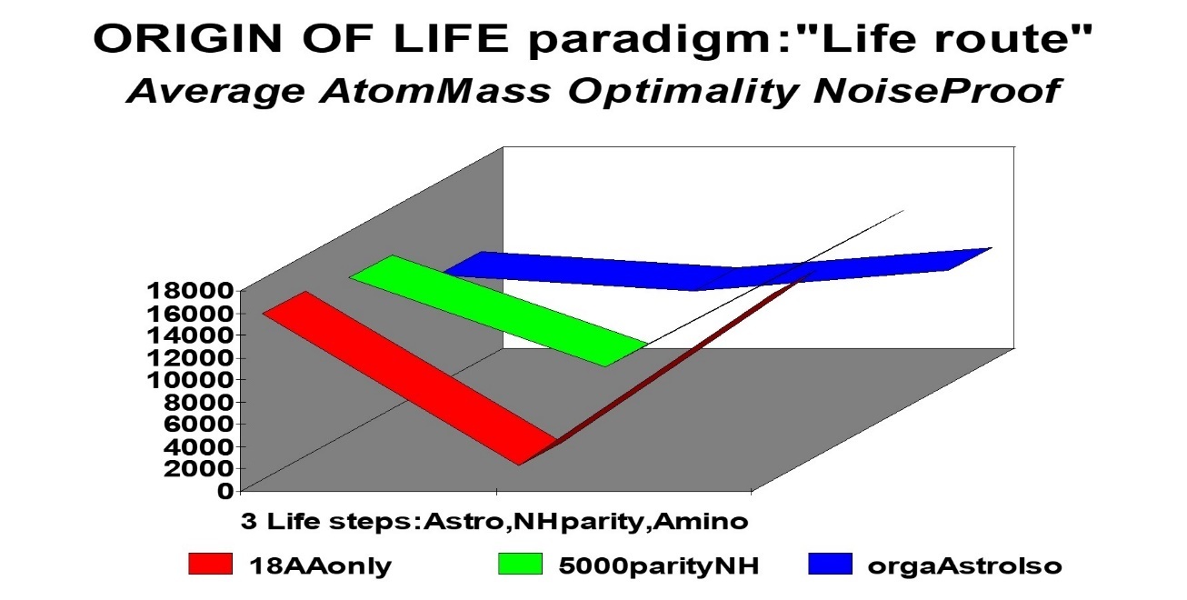 A startling observation opens the door to enormous opportunities in astrobiology: Table 4 and Figure 3 shows a very curious fact: the Pi-mass projection formula seems optimal only for the atomic masses of average atomic weights of basic life bioatoms C O N H. Instead of tiny perturbations on these atomic masses and atomic masses of the individual isotopes (example O16) of each of these atoms “destroy” the optimality and fine-tuning of these projections then, also, consequently all resulting master code perfect tuning. Example here (Table 4) for the Pi-mass projection of Oxygen isotopes and % average weighted atom mass. As shown in Figure 3, isotopes of oxygen lightest and heaviest O16 O18 both produce an error on the projections Pi-mass much higher than that of the average atomic mass of that atom of oxygen consisting of: 99,757% + 0.04% O16 O17 + 0.2% O18. Table 1, Table 2, Table 3, Table 4, Table 5