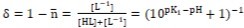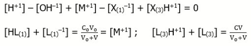 α = [H+1] – [OH-1] = [H+1] – KW/[H+1] = 10-pH – 10pH-14, δ = [L-1]/([HL] + [L-1]) = K1/(K1 + [H+1]), KW = [H+1][OH-1],