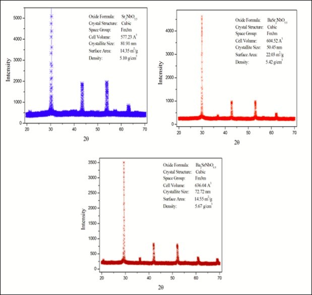 Initially, our synthetic attempts focused on Sr3-xBaxNbO5.5 oxides where x = 0, 1, 2 and 3, however only for the three first compositions were single phase samples obtained. X-ray diffraction measurements (Figure 1) demonstrated the three samples to be free of any obvious impurities and have a faced cubic structure with space group (Fm m). Doping with Ba2+ significantly increases both the cell volume and the density but decreases the crystallite size. The increase in cell volumes is likely driven by the large ionic size of the Ba2+ cation (12 coordinate ionic radius, 1.61 Å). The ionic size of the Sr2+ cation (12 coordinate ionic radius, 1.44 Å) is smaller than the Ba2+ cation. BaSr2NbO5.5 displayed the lowest crystallite size in the series, possibly as a consequence of cation order effects. The materials can be formulated as (BaSr)SrNbO5.5 in order to emphasize the ordering at the B site between the Sr and Nb cations. In the double perovskite structure, it is anticipated that the two smallest cations will order in the octahedral sites, this ordering being a consequence of the differences in the size and/or charge between the two cations. The largest cation will then occupy the 12-coordinate (cuboctahedral) site. The corresponding ionic radii of Ba2+ (12 coordinate ionic radius, 1.61 Å and 6 coordinate ionic radius. 1.35 Å9); Sr2+ (1.44 and 1.18 Å9) and Nb5+ (6 coordinate ionic radius. 0.64 Å9)cationssuggest that the Nb5+ and one Sr2+ cation will occupy the 6-coordinate sites whereas a mixture of Sr2+ and Ba2+ will occupy the cuboctahedral sites12.