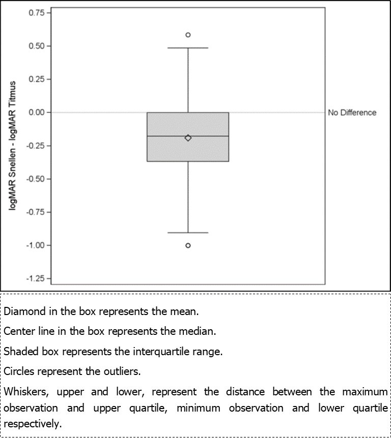 As reported by several studies, VA assessment by two different methods often leads to varied results, and the results of this study are consistent with this observation 18, 19, 20, 21, 22. Hence there is a need for exercising caution when comparing the VA values obtained by two methods. While the purpose of conducting a VA test (e.g., screening versus in-clinic testing versus research) should be considered in deciding upon the VA test to be used, standardizing not only the charts used to measure VA but also the testing protocol and VA reporting is necessary to obtain reliable and comparable results 23, 24.