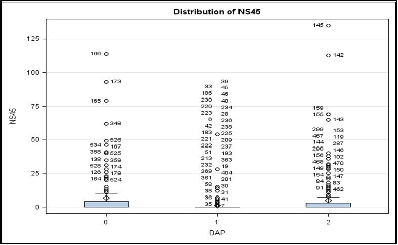 Several combinations were assessed on striga emergency days, the number of striga plant at 45, 60 and 90 days after planting. Thus, for the emergency date, the DAP (Figure 5) used at different level, the DAP and the Sesame interaction (Figure 6) and the interaction between Sesame, DAP and the entries (Figure.7) undergo a significant effect. Concerning the entries, a highly significant effect was observed. In addition, for the number of striga plant at 45 days, a highly significant effect was observed with the DAP (Fig 8), the Sesame and the DAP (Fig 10) interaction, and the entries (Fig11). The sesame seed has a significant effect on the number of striga at 45 days after planting (Table 3 and Fig 9). The interaction Sesame, entries, the interaction DAP, entries, and finally the interaction Sesame, DAP and entries have no significant effect on the number of striga plants at 45 days. To say more, a highly significant effect was observed with the DAP (Fig12), the interaction Sesame, DAP (Fig14), and the entries (Fig 15) on the number of striga plants at 60 days after planting. In addition, a significant impact was observed with sesame seed on the striga plant number at 60 days (Fig.13 and Table 3). The interactions, Sesame and entries, the interaction DAP and the entries, and the interaction DAP, Sesame and the entries have no significant effect on the number of striga at 60 days after planting. The Sesame and the entries interaction, the DAP and the entries, the interaction Sesame, DAP and entries were not significant. Thus, for the striga plant number at 90 days, a high significant effect was observed with the DAP (Fig16), the Sesame seed (Fig 17) their interaction (Fig18 and Table 3) and the entries (Fig19). Concerning, the Sesame and the entries interaction, the DAP and the entries interaction, the Sesame, the DAP and the entries have no significant impact on the striga plant number at 90 days (Table 3).