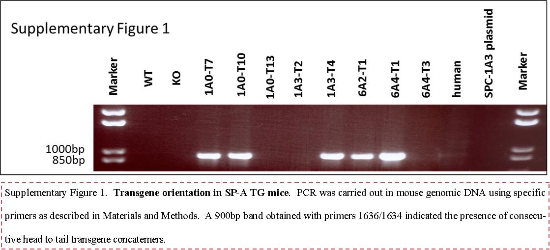 No bands were detected in negative controls of one copy (human DNA, plasmid DNA of 1A3-T4 and 6A4-T3) or controls without the transgene (WT, KO). The presence of head to tail concatemers appeared to result in a band(s) of approximately 6.6kb size shown in Figure 1. The 1A0-T13, although it was shown to have multiple copies by PCR, these apparently are not concatemers (Figure 1, lane 5) because it lacks the intense 6.6kb band. Also no bands were obtained with specific primers to detect head to head or tail to tail concatemers (data not shown). TG mouse lines with a high copy number of a given transgene tended to have a higher level of SP-A expression, although the level of expression and the copy number did not always have a linear relationship (data not shown). This may reflect different sites of integration.