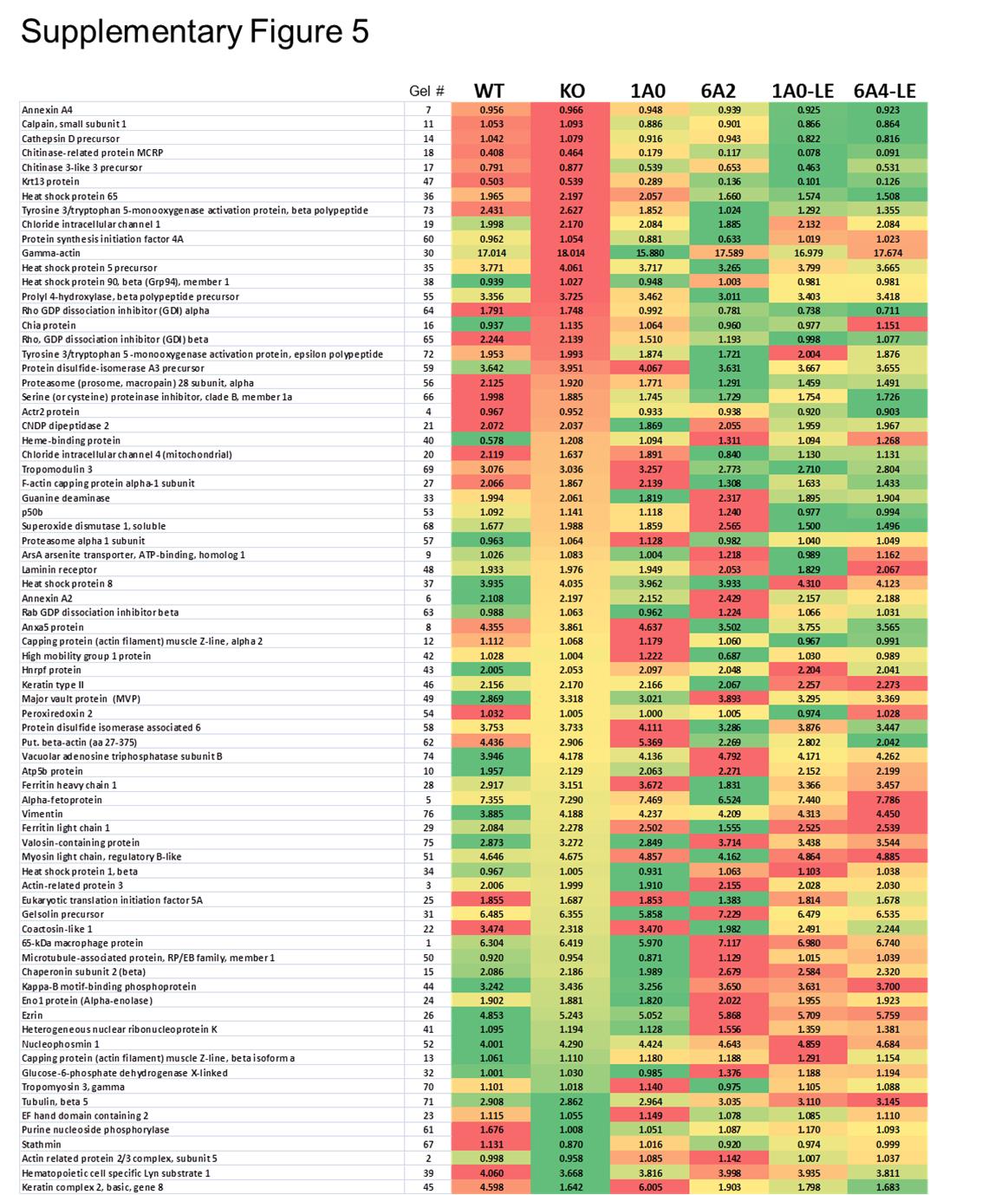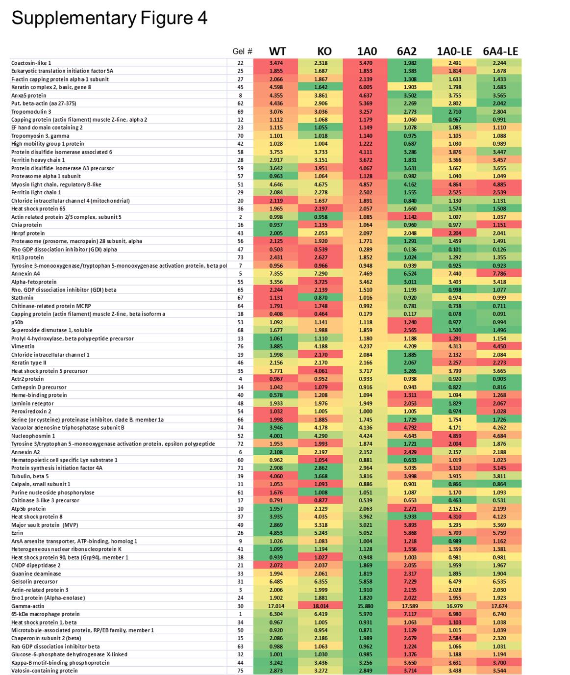Supplementary Figure 4Heat map of all proteins. A heat map is shown for WT mice, KO mice, and all of the transgenic lines used in this study. The protein order is arranged based on levels of expression in 1A0 mice. Red bars have the highest levels, yellow are in the middle of the range, and green are lowest. Intermediate levels are colored with the appropriate shades. The column labeled “gel#” indicates the number of a given protein in the reference gel (Supplementary Figure 3). The numbers in each bar indicate the average normalized volume for the spot/s representing each protein.