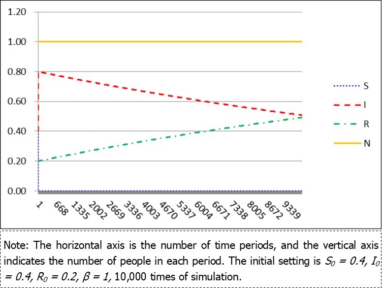 The initial setting are S0 = 0.4, I0 = 0.4, R0 = 0.2, Nt = 1, β = 1. Notice that Nt = 1 means the total population is standard to be 1 and unchanged, while β = 1 represents that the infected people will effective contact with all other person in the area.